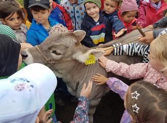 Nachdem besprochen war, was alles aus Milch hergestellt werden kann, wurde das Kälbchen geholt und alle durften es vorsichtig streicheln, was es sich gerne gefallen lies. Wir guckten uns die Milchzähne an, lernten, dass Kühe keine oberen Zähne zum Rupfen haben und fühlten die langsam wachsenden Hörner. Besonders anstrengend wurde es, als wir die große Weide mit Wald und Bachdurchläufen erkundeten. An der natürlichen Kuhtränke blieb der Ein- oder Andere zwar mit seinen Gummistiefeln im Wasser stecken, letztendlich wurden gemeinsam aber alle „Steckenbleiber“ gerettet. So war es auch nicht verwunderlich, dass als wir wieder an der Kita zurück waren, erst einmal der Gartenschlauch zu Hilfe genommen werden musste, um wieder alle sauber zu bekommen, was aber kein Kind störte. Auch unsere Eltern nahmen es mit Humor – Es gibt ja Waschmaschinen!