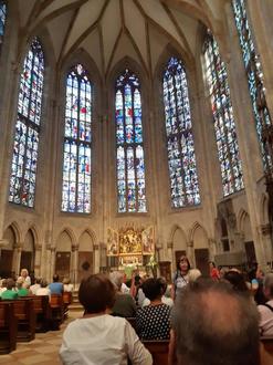 Ziel war die Donauperle Ulm. Dort angekommen, marschierten bei strahlendem Sonnenschein die Ausflügler zunächst zu den niedlichen, schmucken Grabenhäuschen, die früher als Soldatenwohnungen dienten aber jetzt für die Bürger der Stadt bewohnt werden können. Große Bewunderung fand die in der Nähe stehende St. Georgskirche, die mit einer herrlichen Wandmalerei ausgestattet war. Der City Trip führte dann weiter an der Donau entlang zum ruhigen Fischerviertel mit all den herrlichen Fachwerkbauten. Dort im Zunfthaus kostete man die Spezialtäten schwäbischer Küche. Gestärkt vom Mittagessen traf man sich am Münsterplatz, um die Erkundungstour fortzusetzen. Der Weg führte durch romantische, kleine Gassen, durch manch schiefe Türme und Tore, an verschiedenen, markanten, geschichtsträchtigen Brunnen vorbei und zum Teil an der Blau entlang, die in die Donau fließt. Dabei konnte man wichtige, bedeutende, historische Gebäude entdecken, wie das schiefe Haus, ein beliebtes Hotel und Fotomotiv, das traditionsgeprägte Schwörhaus, das wunderschöne Rathaus mit den herrlichen Fresken und der berühmten, astronomischen Uhr, die Synagoge mit ihrer schlichten, filigranen Fassade und das modern, gestaltete Stadthaus. Wissbegierig lauschten die Ausflügler den Erzählungen der Stadtführerinnen, die über die Stadtgeschichte, jüdische Geschichte, das Leben in Ulm und über berühmte Menschen in Ulm erzählten. Als Highlight des Erkundungstages präsentierte sich die Besichtigung des Ulmer Münsters mit dem höchsten Kirchturm der Welt, den man auch erklimmen kann, sowie der drittgrößten evangelischen Kirche in Deutschland. Das Münster ist nicht nur die bedeutendste Sehenswürdigkeit von Ulm, sondern auch ein Spiegelbild seine Geschichte und der Bewohner Ulms. Heute beeindruckt es die Besucher vor allem durch seine Ausmaße und Architektur und dem alten Glanz, der sich noch an viele Stellen bewundern lässt. Zufrieden, reich an Wissen und schönen, unvergesslichen Eindrücken, sowie der Erkenntnis, dass Ulm eine Reise wert ist, kehrte die Reiseschar von der reizvollen Donaustadt in ihre Heimat zurück.