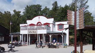 Die Einladung zu dieser Gemeinschaftsveranstaltung des Erlebnisparks, der Gemeinde Heroldsbach und der Seniorenhilfe WIR für UNS e.G. nahmen mehr als fünfzig Personen an. Mathias Abbé als Vertreter der WIR für UNS e.G. begrüßte anstelle des Hausherrn Benedikt von Bentzel, der noch im Urlaub war, die Teilnehmer um 13:30 Uhr, erklärte kurz den zeitlichen Ablauf und wünschte viel Vergnügen. Alle Attraktionen der weitläufigen Parkanlage waren noch in Betrieb und konnten von den Teilnehmern unentgeltlich benutzt werden. Nach dem ersten Bummel lockten nur wenige hundert Meter vom Eingang ab 14:30 Uhr leckere Kuchen und Kaffee die Teilnehmer in das Coffee-House der Westernstadt (siehe Foto), wo man auf der Terrasse, im Erdgeschoss und im Obergeschoss vom freundlichen Personal bedient wurde.