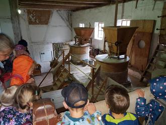 So gestärkt ging es weiter über das weitläufige Gelände bis zur großen Mühle. Wasserrad, Mühlsteine, Getreidesäcke, Einfülltrichter, ... alles wurde genauestens betrachtet und in seiner Funktionsweise überdacht. Nicht ganz einfach war der rutschige Anstieg ganz hoch zu den beiden Mühlrädern, doch auch diese Herausforderung war bald gemeistert.