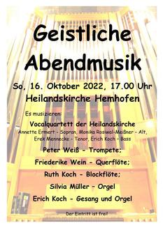 | 17.00 Uhr | Geistliche Abendmusik mit Verabschiedung von Erich Koch in der Heilandskirche in Hemhofen |