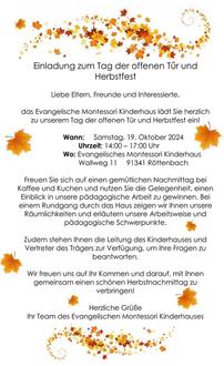 | 14:00 Uhr | Tag der offenen Tür und Herbstfest im Evangelischen Montessori Kinderhaus Röttenbach |
