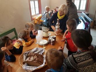 Am Kuhmodell konnte man das Melken probieren und aus der Milch der Kuh sollte Butter hergestellt werden. Dazu galt es die Milch zu reinigen und ihr die Sahne abzugewinnen. Muskelkraft war gefragt, als die Sahne in die Buttermühle geschüttet war, denn nun hieß es rühren, rühren und nochmals rühren. Schließlich war`s gemeinschaftlich geschafft und wir konnten uns über unsere Butter und die dabei entstandene Buttermilch freuen. Das bereitstehende Bauernbrot wurde bestrichen und sofort verkostet. Und was soll man sagen, es schmeckte allen herrlich. Die Mühe hatte sich gelohnt. Selbst gemacht ist halt gleich doppelt gut.