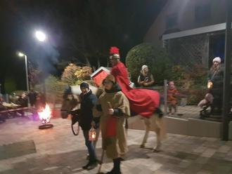 St. Martin zu Pferde führt den anschließenden Laternenumzug an (Wegstrecke: Kirchenstraße, Waldstraße über den Hochberg zur neuen Kita). An der Kita angekommen singen wir noch ein gemeinsames Lied und die Martinsbrote werden geteilt.