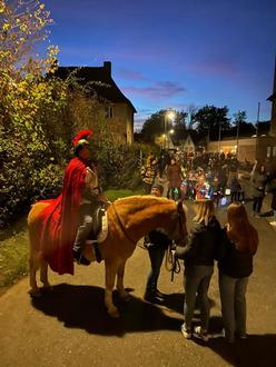 Auch in diesem Jahr konnten die Kinder der Kita „St. Wolfgang“ wieder mit ihren bunten Laternen und einem Licht in der Dunkelheit durch die Straßen ziehen. Am Abend des 11. November versammelten sie sich mit ihren Erzieherinnen und den Erwachsenen in der Kirche, um dort gespannt dem Martinsspiel der Vorschulkinder zuzusehen, welches sie in den letzten Wochen voller Fleiß geübt hatten. Die musikalische Begleitung sämtlicher Lieder übernahm Herr Fischer mit seiner Gitarre und Frau Kertesz unterstützte noch kräftig das Singen der Kinder. Nach der Laternensegnung durch Pfarrer Klaus Weigand zogen diese nach draußen, wo so dann „Ritter Martin hoch zu Ross“ den Laternenzug der Kinder anführte. Pfarrer Klaus übernahm diese Aufgabe ebenfalls sehr gerne und dank der Straßensperrung durch die Feuerwehr Hausen konnten wir einen sicheren Weg zum Kindergartenspielplatz gehen. Am Eingangstor war ein letzter Blick auf St. Martin mit seinem Pferd möglich und die leckeren Martinsbrezeln, welche der Bürgermeister spendierte, wurden verteilt. Zum Ausklang des Festes konnten die Krippen- und Kindergartenkinder mit ihren Eltern und Angehörigen, sowie weiteren Gästen der Öffentlichkeit, noch bei Kinderpunsch, Glühwein, Lebkuchen und Leberkäsbrötchen verweilen.