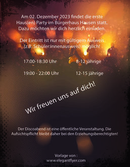 | 02.12.2023 | Haus(en) Party | Bürgerhaus Hausen | 8-15 Jahre |
