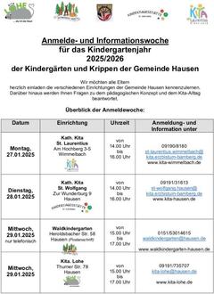 Nach der Anmeldewoche werden die Krippen- und Kindergartenplätze vergeben. Bitte geben Sie bis spätestens 31.01.2025 das Anmeldeformular in der Gemeindeverwaltung ab.
