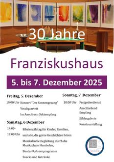 Herzliche Einladung zum 30-jährigen Jubiläum des Franziskushauses, das wir am 1. Dezember-Wochenende gebührend feiern möchten. Am Freitag, den 5. Dezember um 19:00 Uhr mit einer Abendsoiree-Andacht mit Aufführung des Sonnengesangs für Vocalquartett, Klavier und Soloinstrumente sowie anschließendem Sektempfang. Am Samstag, den 06. Dezember ab 14:00 Uhr mit einem Bibelerzählnachmittag für Kinder, Familien und alle, die gerne Geschichten hören. Es erwartet Sie ein buntes Rahmenprogramm mit Snacks und Getränken. Und am Sonntag, den 07. Dezember um 10:00 Uhr mit einem Abendmahls-Festgottesdienst mit anschließendem Emfpang, Bildershow und Kunstausstellung. Schön, wenn Sie mit uns feiern!