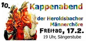 Nach 3 Jahren Tristesse wird es höchste Zeit! Am Freitag, 17.2.2023 findet um 19.00 Uhr (Einlass 18.30 Uhr) in der Sängerstube der 10. Kappenabend der Heroldsbacher Männerchöre statt. Es sind alle Sänger und Mitglieder mit ihren Frauen/Partnerinnen, sowie Freunde und Gönner der drei Männerchöre herzlich eingeladen! Für gute Stimmung sorgt Alleinunterhalter Hansi Müller! Dabei darf und soll natürlich auch das Tanzbein geschwungen werden. Für Essen und Trinken ist wie immer gesorgt. Der Eintritt ist natürlich wieder frei!