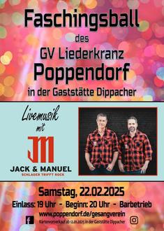Sichern Sie sich also schnell Ihre Plätze für den Faschingsball am 22. Februar 2025 in Poppendorf. Karten gibt es für 10€ in der Gaststätte Dippacher. Es erwartet Sie ein legendär lustiger Abend mit Live-Musik von JACK & MANUEL, Tanzeinlagen verschiedener örtlicher Gruppen und Barbetrieb! Wir freuen uns auf viele Narren aus Nah und Fern und eine tolle Party!