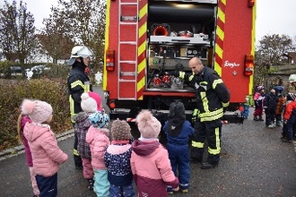 Zu unseren Highlights in der Adventszeit gehörte sicherlich auch die angekündigte Brandschutzübung mit der Freiwilligen Feuerwehr in Hausen. Diese brachten viel Zeit mit, so dass wir nach der Übung auch das Auto, eine Atemschutzmaske und die Werkzeuge der Feuerwehr anschauen konnten.