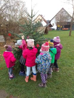Ein Tannenbaum schmückt unseren Garten. Mit viel Freude und leuchtenden Augen, schmückten die Kindergartenkinder unseren Christbaum.