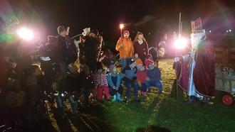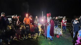 So versuchten wir es mit Musikmachen und Singen, sowie einer Geschichte von St. Nikolaus. Zwischendrin führte uns der Weg immer weiter durchs Dorf und dann über Feldwege zum Kirchenspielplatz. Und wer stand da und wärmte sich am Feuer? Kein anderer als der Bischof Nikolaus höchstpersönlich. Wir begrüßten ihn mit einem Lied und zum Dank verteilte er an alle Kinder seine Säckchen. Bevor er sich verabschiedete gab er uns allen mit auf den Weg zusammen zu halten und füreinander da zu sein. Nachdem uns der Nikolaus wieder verlassen hatte gab es am Spielplatz noch für alle Kinderpunsch und Plätzchen, die die Eltern mitgebracht hatten.