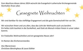 | 18:00 Uhr | Christvesper in der Heilandskirche Hemhofen (Prädikant Hans Batz) |