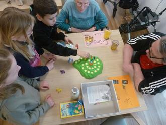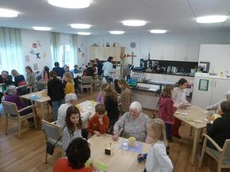 Bereits in der Weihnachtszeit hatte die Ethikgruppe der 3. und 4. Klassen der Grundschule Heroldsbach unter der Leitung von Kathrin Kern die Gäste der Diakonie-Tagespflege Heroldsbach mit selbstgeschriebenen Karten und gebastelten Lesezeichen überrascht. Jetzt kamen die 21 Schüler_innen persönlich vorbei und gestalteten einen wunderbaren Tag für die Senior_innen. Mit dabei hatten sie ihre Lieblingsspiele. Die unterschiedlichen Generationen trafen in kleinen Gruppen zusammen und die Tagespflege-Gäste lernten neue Spiele kennen wie „Lotti Karotti“ oder „Ubongo“. Aber auch ganz klassische Spiele, die auch die Senior_innen kannten, waren dabei, wie z.B. „Schwarzer Peter“. Dieses Kartenspiel hatte ein Mädchen von ihrer Uroma bekommen, die es selbst schon in ihrer Kindheit gespielt hat. Einige Jungs freuten sich dann noch darüber, mit den Senior_innen den besonderen Tischkicker der Tagespflege auszuprobieren.