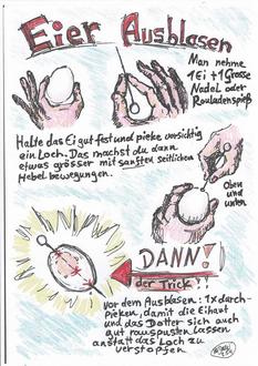 Bitte macht mal öfter Rüherei, Spätzle oder Pfannkuchen und gebt dann die ausgeblasenen Eier wie üblich bei unserer Evelyn Dannhorn, Hauptstr. 7 ab.