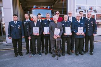 Reihe vorne (von links nach rechts): Klaus Kühn (40 Jahre Vereinsmitgliedschaft), Edmund Wagner (75 Jahre Vereinsmitgliedschaft), Ehrenmitglied Dieter Dunkel, Ehrenkommandant Rudi Brehm (beide 50 Jahre Vereinsmitgliedschaft), Kreisbrandrat Oliver Flake.