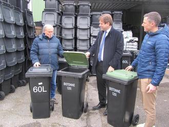 Fachbereichsleiter Entsorgungszentrum Deponie Gosberg Gerhard Raab, Landrat Hermann Ulm und Fachbereichsleiter Abfallwirtschaft Frank Müller mit den neuen Blauen Engel-Tonnen für Rest- und Biomüll