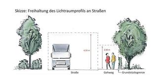 Um eine Beeinträchtigung in der Sicherheit des Straßenverkehrs durch über die Straße oder den Gehweg ragende Äste, Bäume oder Sträucher zu vermeiden, ist der jeweilige Lichtraum entsprechend freizuhalten.