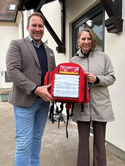 Die medizinische Versorgung in Heiligenstadt ist gesichert: Malteser Diözesangeschäftsführerin Claudia Ramminger überreicht Bürgermeister Stefan Reichold vor dem Eingang des künftigen MGZ einen Notfallrucksack.