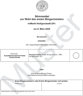 Anbei ein Stimmzettel für die Wahl der ersten Bürgermeisterin bzw. des ersten Bürgermeisters und ein Stimmzettel für die Wahl des Marktgemeinderates im Markt Heiligenstadt i.OFr.