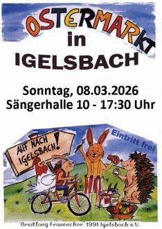 Am Sonntag 8. März findet in der Igelsbacher Sängerhalle wieder der „Igelsbacher Ostermarkt“ bei freiem Eintritt statt. Von 10 bis 17:30 Uhr präsentieren Hobbykünstler ein vielfältiges Angebot an Kunsthandwerk. Neben Osterbasteleien wird auch Hübsches für Haus und Heim angeboten.