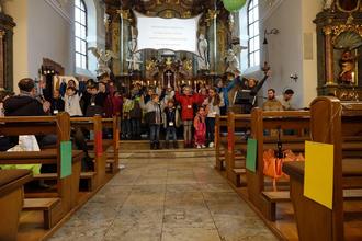 In Kleingruppen konnten die Kinder noch einmal über die Bibel-Geschichte und über das nachdenken, was sie im Leben benötigen und was nicht unbedingt notwendig ist. Zum Vater-Unser-Gebet versammelte Pater Sijoy alle Kinder noch einmal rund um den Altar. Und wie immer begeistere die Musikgruppe mit eingängigen und kindgerechten Liedern die Kirchengemeinde. Zum Abschluss gab es für jedes Kind als Wegzehrung noch einen kleinen Koffer aus Papier mit auf den Weg, in dem sich ein Schokoladenherz versteckt hatte.