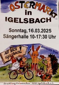 Am Sonntag 16. März findet in der Igelsbacher Sängerhalle der „Igelsbacher Ostermarkt“ bei freiem Eintritt statt. Von 10 bis 17:30 Uhr präsentieren Hobbykünstler ein vielfältiges Angebot an Kunsthandwerk.