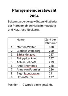 Unsere Kirchengemeinde hat am 16./17. März die neuen Mitglieder für den Pfarrgemeinderat gewählt. 9 Kandidaten stellten sich zur Verfügung, 7 wurden direkt gewählt, zwei wurden nachgewählt.