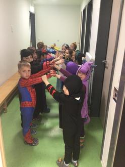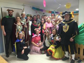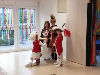 Pünktlich um 9:11 Uhr starteten wir unsere große Polonaise durch das ganze Haus bis wir im fastnachtlich geschmückten Bewegungsraum ankamen. Hier ging es „Schlag auf Schlag“. Kaum hatten wir uns begrüßt und die tollen Kostüme der Großen und Kleinen bewundert, kündigte sich hoher Besuch bei uns an. Die Maxis machten ein großes Tor, der Narhallamarsch erklang und herein kam das große Prinzenpaar.