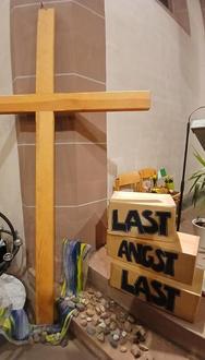 Zu Beginn unseres Gottesdienstes erhielten alle Teilnehmenden einen Stein, der symbolisch für die Lasten und Sorgen stehen sollte, die ja wir auch jeden Tag mit uns herumtragen. Vor einem großen Kreuz, das neben dem Altarraum aufgestellt wurde, konnte dieser Stein dann abgelegt werden. Sehr bereichert wurde dieser Abend von den 10 Flötenspieler*innen, und die Begleitung mit dem Kontrabass unter der Leitung von Christina und Franz Lechner, die durch die Melodien, Schutz und Ruhe soo spürbar machten. Danke!