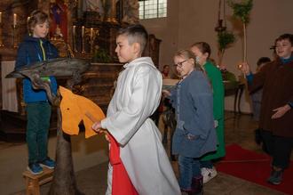 Beim vorletzten Abenteuerland-Familiengottesdienst in der katholischen Kirche in Neckarsteinach am Palmsonntag hatte sich hoher Besuch angekündigt: Vor der Treppe zum Altar war ein roter Teppich ausgerollt und alle Kinder hielten Stöcke mit grünen Zweigen in den Händen und riefen: „Der König ist da - Hosianna!“ Rund fünfzig Kinder waren zusammen mit ihren Eltern, Großeltern, Geschwistern und Freunden gekommen und erlebten einen Vormittag mit Spielen und Geschichten aus der Bibel.