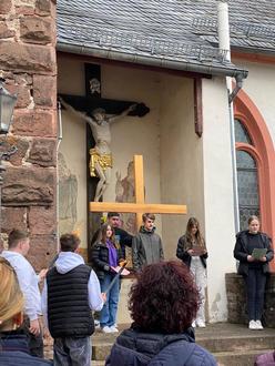 Jugendliche aus Rothenberg und Hirschhorn nahmen die Gläubigen mit auf einen Gang durch die Stadt, um ihnen an verschiedenen Punkten Stationen des Leidens und Sterbens Jesu vor Augen zu führen.