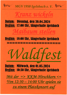 Das traditionelle Waldfest am 1. Mai beim MGV Igelsbach gibt es schon weit über 70 Jahren. Es ist ein Fest für die ganze Familie und sehr gut erreichbar zu Fuß, mit dem Fahrrad und auch mit dem Auto.