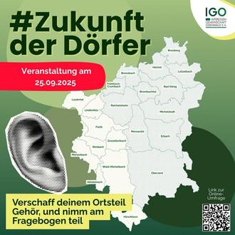 Am 25. September findet in Erbach eine Veranstaltung der Interessengemeinschaft Odenwald (IGO) mit dem Titel „Zukunft der Dörfer“ statt. Mit der übergeordneten Frage „Was brauchen die Dörfer?“ wird der Fokus auf alle Ortsteile in unserer LAG Odenwald gerichtet und diesen ein „Gehör“ verschafft. Zur Vorbereitung der Veranstaltung ist aktuell eine Analysearbeit mit dem Partner „Raumsubstanz“ in Arbeit. Für ein repräsentatives Ergebnis dieser Analysearbeit sind wir auf die Mithilfe der Bevölkerung angewiesen.