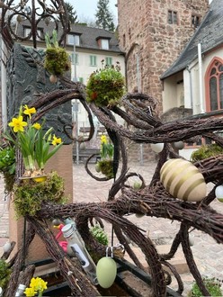 Viele fleißige Hände der diesjährigen Konfirmanden und Firmlinge schmückten den Osterbrunnen an der Marktkirche. Andor, Simon, Kim, Maya, Samira, Janin, Lia, Nele, Leonie, Talisa, Finja, Fenia, Lea und Mia klebten, bastelten, wickelten und dekorierten innerhalb kürzester Zeit und den freudigen Augen von Christina Lechner, die in diesem Jahr den Brunnen mit den Jugendlichen beider Kirchengemeinden inszenierte. Das Ergebnis kann sich sehen lassen.