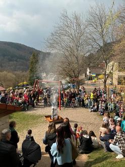 Nach zwei Stunden Bastelzeit trafen sich Alle auf dem Außengelände. Hier wartete schon der Schneemann in einer Feuerschale, den Kinder und ErzieherInnen gemeinsam gestaltet hatten. Gemeinsam sangen wir Frühlingslieder und im Anschluss wurde der Schneemann verbrannt. Es war ein wunderschönes Frühlingsfest mit vielen fröhlichen Begegnungen, Gesprächen und Kinderlachen.