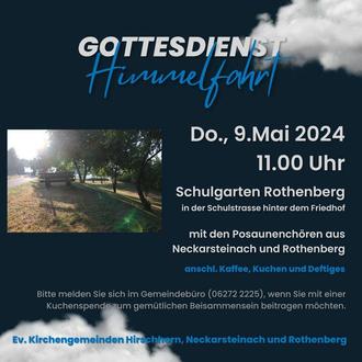 Am Donnerstag, 9. Mai findet um 11.00 Uhr der Gottesdienst zu Himmelfahrt für alle drei Gemeinden der Südkurve (Hirschhorn, Neckarsteinach, Rothenberg) im Schulgarten in Rothenberg (Schulstraße hinter dem Friedhof) statt. Im Anschluss gibt es Deftiges aus der Hand sowie Kaffee und Kuchen. Bitte melden Sie sich im Gemeindebüro, wenn Sie mit einer Kuchenspende zum gemütlichen Beisammensein beitragen möchten.
