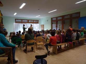 Das Theaterstück „Geknitter.Gewitter“- mit Papp und Pia wurde in unserem Bewegungsraum aufgeführt. Alle Kinder trafen sich vor dem Bewegungsraum und wurden von Papp begrüßt. Danach suchte sich jeder einen Sitzplatz vor der Bühne. Mit Papp und ihrer Freundin Pia kam eine lustiges experimentieren, untermalt mit schöner Musik- rund ums Papier in Gange. Zeitungspapier, Papprollen, Pergamentpapier, Karton- alles wurde auf verschiedenste Weise bearbeitet. Welche Geräusche entstehen beim Knüllen, Wedeln, Reißen? Wie kann ich Papier falten, was entsteht daraus? Zwischen den Beiden entstehen viele spaßige, verblüffende, wundersame, überraschende und auch ärgerliche Interaktionen.