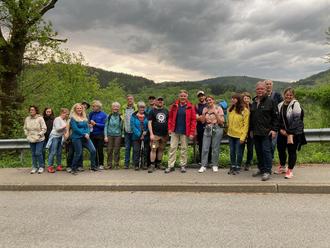 Zum Hirschhorner Stadtjubiläum startete eine Gruppe mit 21 Erwachsenen, Vincent in der Kindertrage und ein Hund zum zweiten Streifzug unter der Führung von Richard Köhler, Geopark-vor-Ort-Begleiter Neckartal, in Richtung Ramsau.