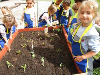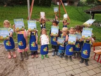 Mit großer Freude und Motivation pflanzten dann die jungen Gärtner die Setzlinge und Gemüsesamen vorsichtig in die Erde ein. Noch kräftig gießen, Pflanzenschilder einstecken und fertig! Zum Schluss bekamen alle Teilnehmer eine Urkunde.