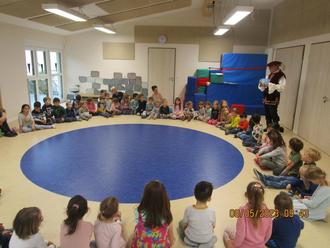 Dazu besuchte uns zu unserm gemeinsamen Morgenkreis „Ritter Friedrich III. Er erzählte uns ganz viel über den Bau der Burg und wie lange dies gedauert hat. Er berichtete uns, wer denn alles in der Burg gelebt hat, warum Türme rund und nicht eckig sind, warum es in den Türmen und Mauern längliche Öffnungen gibt und vieles, vieles mehr.
