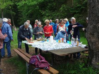 Nun war es soweit, am 24. Mai 2023 wurde die 4.500 km Marke erreicht. Es ging an der Schneidmühl vorbei in Richtung Brombacher Wasser. Für 24 Wanderer gab es dann einen Überraschungsstopp mit sehr gutem Brot, Hausmacher Wurst und verschiedenen Getränken.