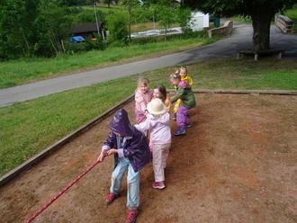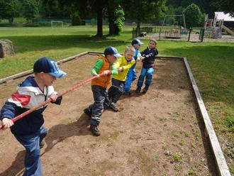Anschließend gab es auf der großen Wiese ein Fußballspiel und danach einige Runden Tauziehen. „Mädchen gegen Jungs“ war das Motto. Alle haben gezogen bis zum Umfallen… mit einem ausgeglichenen Endstand. Leider ging der Vormittag viel zu schnell zu Ende und wir mussten wieder den Heimweg antreten. Es war ein sehr schöner Wanderausflug.