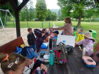 Danach sind alle auf dem Spielplatz ausgeschwärmt. Das Drehkarussell war wieder einmal sehr beliebt bei den Kindern. Überrascht waren alle, als plötzlich eine Kollegin vom Kindergarten mit einer Kiste voll Eis auf dem Spielplatz stand. Freudig haben sich alle das Eis schmecken lassen.