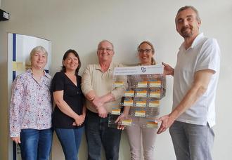 Das Präventionsteam hat kürzlich die 8. Tafel an den Bürgermeister der Stadt Hirschhorn, Martin Hölz, übergeben. Mit dabei war außerdem unter anderem Peter Hofmann, der 2021 an Akuter Myeloischer Leukämie (AML) erkrankte. Durch eine Stammzellenspende hat er im vergangenen Jahr die Chance auf ein zweites Leben erhalten.