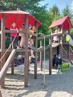 Dort angekommen wird erst einmal das Picknick eröffnet, um danach gestärkt los zu flitzen! Die Kinder rutschen, schaukeln bis „in den Himmel hinein“ und klettern sehr geschickt den Turm hinauf.