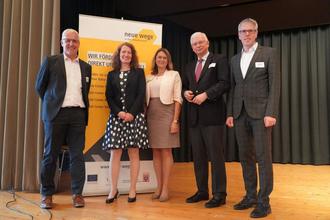 Auch der Referatsleiter im Hessischen Ministerium für Arbeit, Integration, Jugend und Soziales, Rolf Keil, kam zur offiziellen Jubiläumsfeier und übermittelte Grußworte der Ministerin Heike Hofmann. „Der Eigenbetrieb Neue Wege -Kommunales Jobcenter- des Kreises Bergstraße war schon immer ein Ort, an dem buchstäblich regelmäßig neue Wege gegangen werden. Die vielen, innovativen Mitarbeitenden geben hier dem Sozialstaat ein Gesicht und machen ihn erlebbar. Im Namen der Landesregierung möchte ich mich hierfür bei Ihnen bedanken und Ihnen versichern, dass wir uns weiterhin dafür einsetzen werden, dass die kommunalen Jobcenter erhalten bleiben sowie die Mittel erhalten, die sie benötigen“, so Rolf Keil zu den Anwesenden.