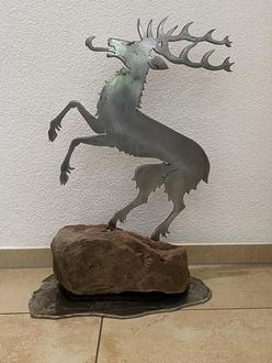 Zu den Maßen: ca. 75 cm hoch, ca. 58 cm breiteste Stelle, Gewicht ca. 35,4 kg, Beschreibung: Abbildung nach dem originalen Stadt-Hirsch, aus Stahl gefertigt, auf Stahlplatte mit Sandstein gefertigt, designt von Claus Schäfer, produziert von Holger Drewes und Bernhard Schmitz