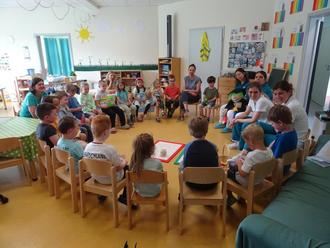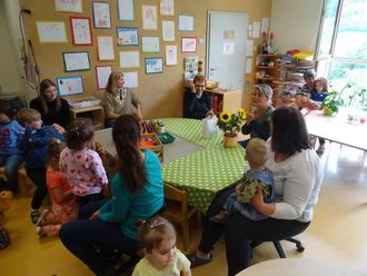 Ella, Annette und Walter versorgten uns mit allerlei süßen und deftigen Leckereien. Es gab Laugenstangen, Brötchen, Rohkost, Obst, heiße Würstchen und vieles mehr. Die selbstgebackenen Waffeln waren das Highlight aller Kinder. Auch wir Großen wurden mit einem ausgiebigen Frühstück und Nachtisch verwöhnt. Zum Abschluss des tollen Vormittags versammelten sich alle Gruppen in der Regenbogengruppe, um gemeinsam zu singen und danke zu sagen.